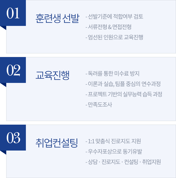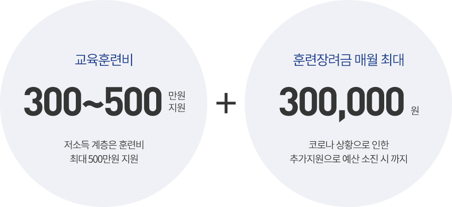 · 지원과정고용노동부로부터 적합성을 인정받아 훈련비 지원대상으로 공고된 훈련과정 · 지원대상실업자, 근로자, 특수형태근로종사자, 자영업자 * 세부훈련정보는 직업훈련포털(hrd.go.kr)에서 직접 검색·확인 가능 |